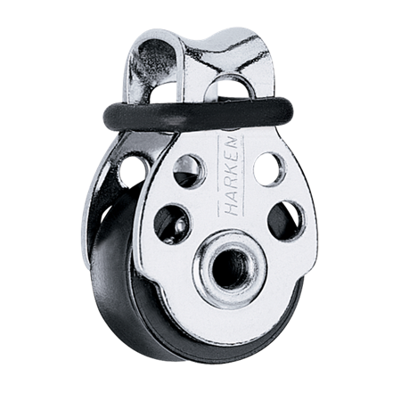 The 16 mm is Harken’s® smallest block. It is perfect for small synthetic control lines found on high-tech dinghies. The patented bearing system uses stainless steel balls in a captive grooved race and has a 250 lb (113 kg) maximum working load. The 404 uses an O-ring to keep the line in the sheave during intermittent loading.